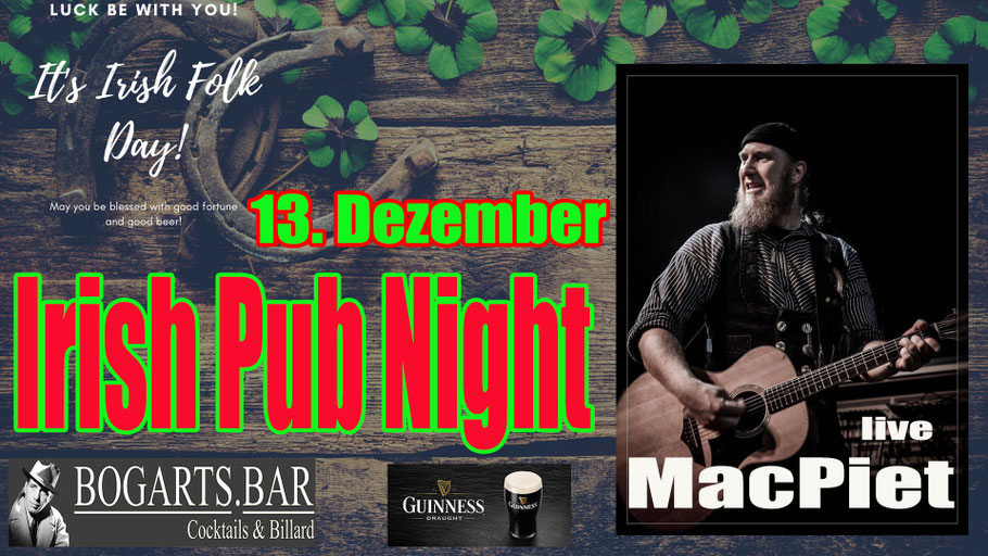 Am Samstag 13. Dezember findet wieder die Möllner Irish Pub Night im Bogarts statt. Nach dem grandiosen Erfolg der letzten Auftritte von MacPiet bei uns und sagten